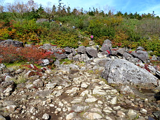 | 山行記 | ●栂池自然園の紅葉は既に最盛期を過ぎているということだが、高度差があるので、途中では紅葉まっ盛りのところもあるだろうと、民宿の朝食をおにぎりにしてもらって、朝早くから出かけることにした。 ●三連休も中日、しかも紅葉の季節ということで、ゴンドラ駅の発券所には開く前から長い行列ができていた。こちらは、泊った民宿でチケットを手に入れたので余裕だ。それでも、ゴンドラに乗るための列に並んで順番を待った。 ●ゴンドラに乗り、高度が上がるつれ紅葉が鮮やかになる。後立山連峰は少し雲が邪魔だが紅葉を背景にずらりと並ぶ。振り返れば妙高山や火打山などの頚城山塊や高妻山などの戸隠連峰も雲の上に浮かんでいた。 ●ゴンドラからロープウェイに乗り換えるが、この辺りの紅葉は最盛期で、栂池自然園駅までの間もロープウェイから見る紅葉の山肌が美しかった。 ●栂池自然園駅に着くと栂池自然園まで歩き、ロープウェイから下りた人たちのほとんどが栂池自然園に入って行くのを見ながら、自然園入口手前の登山口から山道に入る。 ●自然園入口横から少し下り、何度か沢を渡り、その後ステップの大きい木の階段で急坂を登り高度を稼ぐ。左手には、後立山連峰を始めとする北アルプスの山並、振り返れば頚城山塊や戸隠連峰などが雲の上に浮かんでいる。 ●傾斜も緩くなり、樹林も無くなってくると「銀嶺水」という水場に出る。さらに登ると、天狗原直下の広場に出る。ここまで来ると、後立山連峰がより近くに迫てくる。 ●高山植物もそろそろ終わりというこの季節だが、そこではミヤマリンドウや咲き終わりのミヤマアキノキリンソウなどがかろうじて咲き残り、チングルマの紅葉と綿毛が美しかった。 ●天狗原直下からは、急坂を少し登り、木道が現れると天狗原に着く。天狗原は現在木道の工事中で、一部の木道は既に完了しており、荷上げされた資材がブルーシートとネットを被っていた。 ●天狗原では多くの登山客が休憩をしており、目の前には白馬乗鞍岳への急斜面が立ちはだかっている。ここで休憩して展望を楽しんだ後、引き返す登山客も少なくないのだろう。 ●天狗原から木道を進むと、風吹大池への分岐が現れ、さらに進むと大きな岩が積み重なる歩きにくい道に変わる。道はしだいに急になるが、ここがこのコースの最大の急登になる。 ●急な岩の道を登り詰めると、さらに大きな岩を飛び石で登るようになり、やがて雪渓に出る。この時季の雪渓は、夏と比べるとよく融けていて、雪を踏まなくても通過できる。 ●後は急な岩混じりの斜面をジグザグに登り切れば、白馬乗鞍岳山頂の一角に着く。右手の柵の中には三角点が見えるが、山頂とされているのはもう少し先で、そこへは平坦だが岩が多く歩きにくい道を歩く。 ●この辺りは、よく雷鳥を見かける場所だが、これだけ天気が良いので期待薄だ。やがて大きなケルンが見えてくるが、そこが白馬乗鞍岳山頂だ。山頂からは、ハイマツの先に白馬三山や小蓮華岳が見えるが、白馬大池はここからは見ることができない。 ●登り始めた時よりも雲が増えてきて、頚城山塊や戸隠連峰などもはっきりと見えなくなってきたので、下山を始める。下山は来た道を戻るが、この時間、まだ登って来る登山客が多く、すれ違いで大分時間をロスしてしまったがそれは仕方がない。 ●栂池自然園前まで降りてきたが、栂池自然園の紅葉は終わりだということなので、栂池自然園はパスして早々と下る。帰りは、光線の具合が良くなり、往きよりも一層綺麗な紅葉を見ることができた。 |