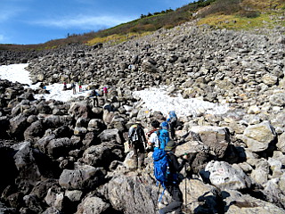 | 天狗原と白馬乗鞍岳 | 風吹大池分岐 | この時期は雪の少ない雪渓 |