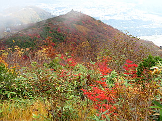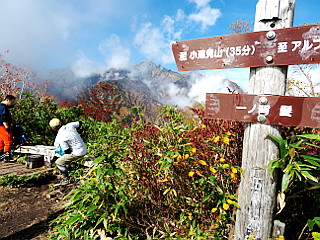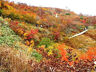 | 山行記 | ●前日の白馬乗鞍岳の紅葉が良かったので、最終日は、それより少し標高の低い小遠見山は行くことにした。民宿の朝食を早くしてもらい、五竜とおみテレキャビン乗り場へ向かう。 ●テレキャビンの運行開始時間は、ネットで流されていた7:30とは違い、8:15ということだが、既に発券所には行列ができている。やはりここも三連休と紅葉シーズンが重なり、多くの登山者や観光客が押しかけているようだ。 ●テレキャビンの運行開始時間になると、それ程待たずテレキャビンに乗ることができた。スキー場のゲレンデには数十頭のサルの群れがいて、広いゲレンデに散らばってエサを探しているようで、子ザルを連れたサルも多かった。 ●高度が上がるにつれ紅葉が冴えてくる。テレキャビンを降りると、展望リフトに乗りさらに上へ向かう。ゆっくり進むリフト沿いの紅葉は、赤が鮮やかでいい紅葉だ。その先に見える山肌の紅葉も近年見たことが無い程の鮮やかさだ。 ●展望リフトを降りると、まず、下から見て紅葉の良さそうだった地蔵の頭へ登ってみる。少し前からガスが湧き出して鮮やかな紅葉の山肌は見え隠れといった状態だったが、地蔵の頭周辺の紅葉は素晴らしかった。 ●地蔵の頭からは、一旦下り、地蔵の池からの道を合わせて、いよいよ小遠見山への登りに取り付く。いきなり木の階段のある急坂なので大変だが、ガスの合間に見える五竜岳の雄姿と山肌の紅葉が素晴らしい。 ●しばらく急な登りを登り切ると見返り坂に着く。そこから紅葉の素晴らしい地蔵の頭を俯瞰したかったが、ガスがかかり見ることができなかったのは残念だ。 ●見返り坂からも急な木の階段のある坂が続くが、この辺りの紅葉もまだまだ美しく、それを励みにひたすら登る。一ノ背髪に着く頃にはガスがしばしばかかるようになり、せっかくの五竜岳などの展望や山肌の紅葉などがもったいない感じだ。 ●一ノ背髪からは展望も開け、道も緩やかな部分が多くなる。しだいにガスがかかる時間が多くなり、紅葉もこの辺りは最盛期を過ぎた感じだ。 ●二ノ背髪まで来ると、いよいよ小遠見山の山頂部が見えてきて、開放的な尾根道が、緩やかに山頂まで続いているのを見ることができる。 ●山頂手前に、五竜岳へと続く縦走路との分岐があり、そこから一登りで小遠見山山頂に着く。山頂には三角点やベンチがあり、開けた山頂からは360度の展望が得られるところだが、山頂全体にガスがかかる時間が多くなってきてもどかしい。 ●時々開ける展望を楽しんだ後、下山にかかる。下山は来た道を戻るが、最後は地蔵の池方面の紅葉を楽しんだ後、高山植物が植栽されている高山植物園を通って下る。 ●さすがにこの時季、高山植物園に咲いている花は少なかったが、テレキャビンの乗り場に着くと、きのこ汁の振る舞いがあり、冷えた体を温めることができた。後は、再びテレキャビンに乗って紅葉を楽しみながら、山麓駅まで戻った。 |