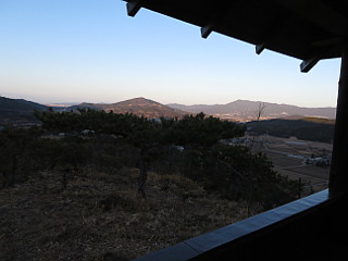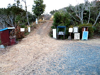 | 比丘尼駐車場とおすすめの小径入口 | 東屋から見る赤く染まる本宮山、吉祥山 | 林道 |