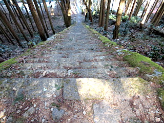 | 展望所から見る岩屋本堂 | 苔むして滑りやすい長い石段を下る | 裏行場の油こぼし |