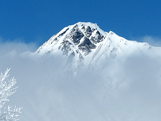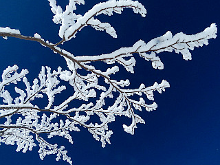 | 地蔵の頭から見る小遠見山と五竜岳 | 青空に霧氷が映える | |