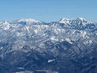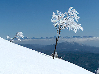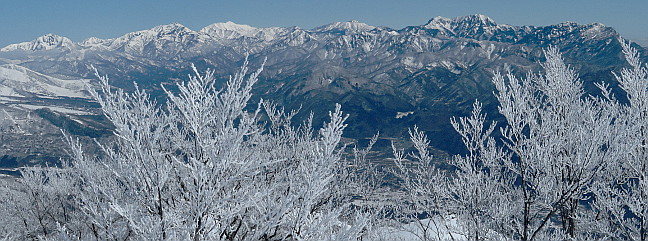 | 霧氷と頚城山塊、戸隠連峰の峰々 | 一ノ背髪から見る小遠見山 | |