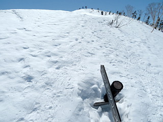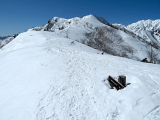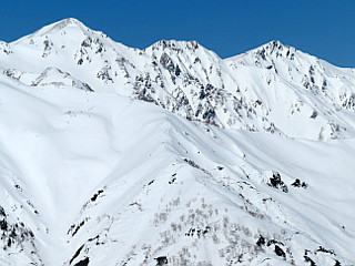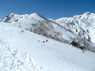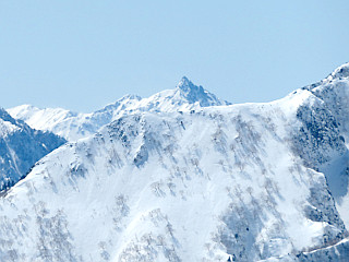 | 山行記 | ●しばらく4月から5月並みの陽気が続いたが、この日から一転して寒くなるという。予報は全国的に晴れ、放射冷却で冷え込む早朝に豊川を出発し、今シーズン最後の雪遊びに出かけた。 ●暖かかった頃大雨が降ったという大北地方は、急速に雪解けが進み、低い山には既に雪が無さそうなので、標高の高いこの山を登ることにした。 ●スキーシーズンも終盤を迎えているが、白馬五竜テレキャビンの一番近い駐車場は既に満車で、駐車場整理員にその下の未舗装の駐車場に案内された。 ●支度を済ますと、道路の下を通る地下道の階段を登って白馬五竜テレキャビンの駅まで歩く。白馬五竜テレキャビンも既に朝一番の混雑時間が過ぎたのか、それ程待たずに乗ることができた。 ●白馬五竜テレキャビンからは、霧氷が青空をバックに美しい。右には五竜菱が浮き出る五竜岳や白馬三山、高度が上がるにつれ背後に頚城山塊や戸隠連峰などの山々が見えてくる。 ●アルプス平に着いたが、スキーやスノーボードが滑走するゲレンデをスノーシューで登るのは危険なので、無雪期と同じように、すぐ下のリフトに乗り、リフト終点まで上がることにした。 ●リフト終点に着くと、地蔵の頭へ登るのだが、なかなか急そうだ。それでもスノーシューで登れない程ではないので、何とか登り切ると、今まで見えていた山々がよりすっきりと見ることができ、これから目指す小遠見山とそこへ続く尾根も見ることができた。地蔵の頭周辺の霧氷も美しく見応えがある。 ●地蔵の頭から一旦下ってトレースが錯綜する急坂を登る。少しまとまった登りを息を切らしながら登り切ると、樹林帯を抜けて尾根筋に出る。振り返れば地蔵の頭が低く見え、その背後には頚城山塊や戸隠連峰のパノラマが広がる。 ●見返り坂を探すが、案内板が雪に埋もれているのか、結局わからないまま一ノ背髪まで登ってしまった。標高が上がると、今まで見えていた山々に加え、八ヶ岳や南アルプスなども見えるようになってくる。 ●一ノ背髪から二ノ背髪まではそれほど遠くないが、二ノ背髪直下は、痩せた急な登りとなるので慎重に登る。二ノ背髪まで来ると、鹿島槍ヶ岳も見えてくるが、双耳峰には見えず、カクネ里がよく見える。 ●二ノ背髪まで来れば傾斜も緩くなる。小遠見山も一段と近くなり、山頂に居る登山者の姿も確認することができる。左側には断崖に張り出した雪庇が面白い。 ●緩やかな登りも、かろうじて見える縦走路分岐の案内坂を過ぎれば後一登りで小遠見山山頂に着く。雪が多く、盛り上がっているせいか、無雪期よりも少々狭く感じる山頂には、既に2グループ5人の登山者が休憩をしていた。 ●山頂からは、これまで見えていた山々に加え、富士山や中央アルプス、南アルプスもさらに奥まで見ることができ、北アルプスも常念岳や槍ヶ岳まで見ることができた。中でも圧巻だったのは、カクネ里から荒々しく屹立する鹿島槍ヶ岳だった。 ●到着したばかりの山頂は風も無くて暖かく、360度の展望はいつまで見ていても飽きなかったが、しだいに風も出てきて少し寒くなってきたので下山にとりかかる。帰りは来た道を戻った。 |