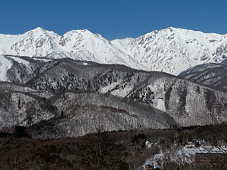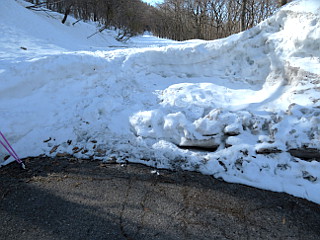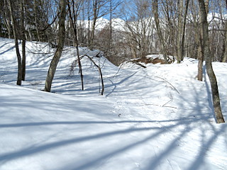 | 山行記 | ●今回の信州2日目は、山は登らずに観光で行こうと思っていたが、この日も午前中は昨日のように天気がいいということだったので、軽く落倉浅間山に登っていくことにした。 ●今シーズン、大町辺りはすっかり雪解けが進んでいるが、栂池近辺はまだ雪が多く残っているので、まだスノーシューを楽しむことができるのではないかと、雪の無くなった道路を走って登山口へ向かった。 ●登山口の林道入口は、先月の状態と比べると随分雪が減ってるが、まだまだスノーシューを楽しむことができそうなので、早速スノーシューを履いて林道を歩き始めた。 ●最初からついていたトレースは、途中で斜面を登っていったようで消えて、すぐに下から登ってくる複数のトレースが合流した。ある程度の雪の厚さがあったが、一か所深く雪が解けている部分があり、そこは迂回して進んだ。 ●林道の上部で、山頂方面へショートカットするトレースを見送ると、すぐに展望の開ける場所があるが、そこからは、鹿島槍ヶ岳から五竜岳、唐松岳、白馬三山と続く後立山の稜線を見ることができた。 ●林道終点に着くと、バックカントリーフィールドの案内に従って、樹林帯の山道に入る。すぐに尾根筋に出るので、それを辿って落倉浅間山を目指す。2度程下ると先程のショートカットのトレースと合流し、さらに進むと鳥居が現れる。 ●鳥居は、先月訪れた時よりも大分雪が融け、潜ることができる程になっていた。しかし、その先の急坂は、ところどころ雪が無くなっており、スノーシューでは真すぐ登れないので、雪のある所を選びながら大回りして登ることにした。 ●傾斜が緩やかになると、祠のある落倉浅間山山頂に着くが、先月は雪の下だった祠を確認することができた。 ●お参りを済ますと、疎らな樹林越しに見える、後立山連峰や栂池高原の様子を確認して下山を始めた。帰りは時間短縮のため、ショートカットしてみることにする。ショートカットは以外にあっけなく林道に戻ることができた。 ●それならば、場合によってはこのコースを利用するのもいいだろうと思いながら、合流点から展望地まで林道を戻り、もう一度後立山連峰の展望を楽しんだ後、林道を下って車まで戻った。 |