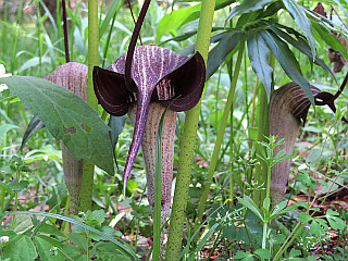 | 山行記 | ●一時初夏の陽気にまでなったこの地方だが、この日はまた最低気温が一桁になるということで、何を着ていっていいかわからない時季だ。とにかく寒くならないように、少し暖かめのウエアーを着て出かけることにした。 ●滝頭公園駐車場に着くと、日差しは春の暖かさがあるが、冷たい風がやや強く、やはり寒い。滝頭公園ではこの日、「滝頭桜まつり」が行われるらしく、数台の屋台が準備を始めていたが、肝心の桜は既に散り果てている。 ●準備を済ますと、舗装道脇の歩道を歩いて登山口へ向かう。今回は、シデコブシがまだ見られるかもしれないと、藤七原湿地から登ることにした。 ●この日は中学生の野球の大会があるらしく、駐車場には、中学校のチャーターしたバスが何台か停まっており、歩いていくときも、ユニフォームを着た自転車の地元中学生が、次々と挨拶をして通り過ぎていった。 ●藤七原の駐車場に着くと、藤七原湿地に入っていく。期待したシデコブシは既に散り果てていたが、僅かだがかろうじて咲き残ったものを見ることができた。 ●藤七原湿地の上端さらに登っていくと、暗い樹林の中、スルガテンナンショウが一斉に咲き出しており、「山野草村衣笠団地」でもいろいろな春の花が見られた。未舗装の林道に出ると、殿様新道入口から衣笠山へ向けて登っていく。 ●衣笠山山頂に着くと、展望台から富士山を探すが、この日も天気はいいものの遠くは霞んで富士山や南アルプスが見えないどころか、本宮山や吉祥山などの三河の山すらはっきりと見ることができなかった。 ●この日も桟敷岩新道を下る。直登コースから広く明るい防火帯の道を歩くが、予想通りウラシマソウがいたるところで咲いており、ムベやヒメウズ、スルガテンナンショウなどの春の花盛りだった。 ●仁崎峠からは、急登を登って滝頭山山頂へ。滝頭山からは長興寺自然歩道を歩き、中西山を過ぎて長興寺分岐から荒れた林道へ下る。荒れた林道ではアケビやミツバアケビ、スミレの仲間が目立っていた。 ●荒れた林道からは、三ツ俣、迷子尾根の頭を経て不動岳山頂へ、この辺りではジロボウエンゴサクやアオキの花が目立ち、タニギキョウやウラシマソウが咲き始めていた。 ●不動岳から再び防火帯の広い道を歩き、赤松山を経て扇原からクチナシの道を下る。クチナシの道では、イカリソウが所々に咲き、スミレやキランソウの花、ササユリの葉などが目立っていた。 ●滝頭公園駐車場に戻ると、「滝頭桜まつり」が始まっており、朝見た屋台が食べ物のいい匂いを放ち、大道芸人の周りには人だかりができていた。 |