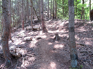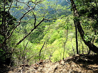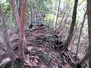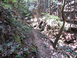 | 西尾根コース分岐 | 沢を渡って植林帯を登る | 西尾根に出る |
