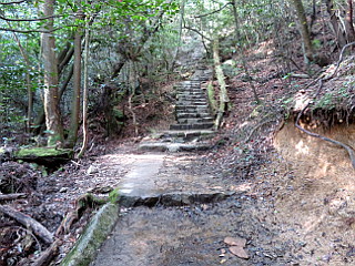 | 宮島フェリーから見る厳島神社と弥山 | ロープウエイへの道と分かれ紅葉谷を登る | 急な石段が多い |