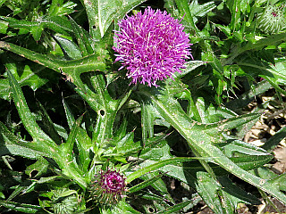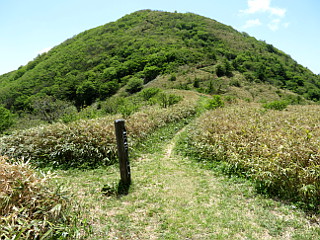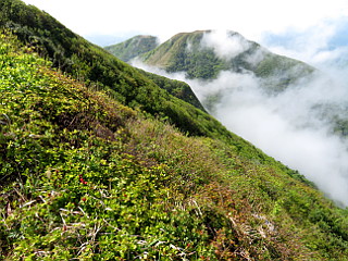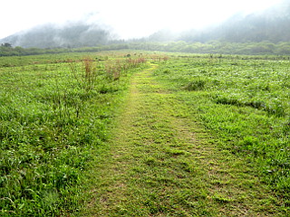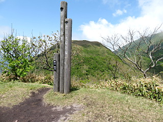 | 山行記 | ●前日は生憎の雨で、予定していた、広島県、島根県の最高峰である恐羅漢山登山を断念したところだが、この日は晴れの予報。しかし、出雲のホテルを早めに出て三瓶山登山口の西の原を目指すが、濃い霧がなかなか取れず、そこから見えるはずの三瓶山の山並みも見ることができなかった。 ●当初は、東の原から登り、女三瓶山から男三瓶山、子三瓶山、孫三瓶山と周回する予定だったが、前日立ち寄った出雲大社門前の観光案内所で、先日の地震の影響で女三瓶山から男三瓶山を繋ぐコースが一部崩壊により通行止めになっているという情報を得たため、急遽予定を変更して西の原から登ることにした。 ●駐車場から舗装道路を渡って一面の草原の中を進む。タニギウツギやアマドコロ、ニョイスミレの花が咲いているが、葉には未明まで降っていた雨粒が光っていてとても美しかった。 ●カラマツの樹林帯に入ると、扇谷コースを分け、道は大きくジグザグを切って登るようになる。しばらく続く樹林帯が終わると視界が開け、男三瓶山の山頂部や隣の子三瓶山、車を置いた西の原などが見られるようになる。 ●2つピークを越えると道も平坦になり、ところどころ地面が露出した草原の中を歩くようになる。子三瓶山方面への道を分けると、緩やかに登れば三瓶山群の最高峰の男三瓶山山頂だ。 ●広い山頂広場からは、360度の展望が広がる。予備知識が無く、何が見えているのかわからないのが残念だが、女三瓶山から子三瓶山、孫三瓶山の三瓶ファミリーは見ることができた。 ●男三瓶山からは子三瓶山へ向かう。先程の分岐の先から急坂を下る。どこまで下るのかわからないぐらい大きく下るので、男三瓶山からはかなり低く見えていた子三瓶山が段々高く見えてくる。 ●急な下りも扇沢分岐までで、そこから小ピークを一つ越えたところから子三瓶山への登りに取り付く。子三瓶山へは不規則な細かいジグザグを切って急坂を登る。急坂が一段落すると、孫三瓶山への道を分け、子三瓶山の山頂に至る。 ●子三瓶山山頂からの眺めも良く、背後には今来た男三瓶山がどっしりと大きく聳え、子三瓶山より低い孫三瓶山や鉄塔が林立する女三瓶山も見ることができる。 ●子三瓶山からは、一旦先程の分岐まで戻り、孫三瓶山へ向かう。ここもやはり急な下りを下るが、男三瓶山からの下りとは違い、草原の中を下る。いつの間にか霧も消えてきて、青空と山の斜面の緑が眩しい程美しい。 ●ヤマツツジに混じってレンゲツツジも咲く道を下ると、馬越と呼ばれる子三瓶山と孫三瓶山の鞍部の十字路に着く。それを右に下ると国民宿舎さんべ荘へ直接下ることができ、左へ行くと室ノ内池だが、ここは孫三瓶山への登りに取り付く。 ●三瓶山群は、各ピークが際立っている分それぞれの間の上り下りが急で、孫三瓶山への登りもその例に漏れないが、最後の登りと思ってひたすら登る。孫三瓶山山頂も展望が良く、現在通行止めとなっている女三瓶山から男三瓶山へ続く尾根道が良く見えた。 ●孫三瓶山からは国民宿舎さんべ荘を目指して南へ下る。これまでの急な道とは違い、緩やかに下る尾根道は快適だが、なかなか高度が下がらないのが少し心配になってくる。それでも道は途中で尾根を外れ急な坂を下るようになり、やがて馬越から下ってくる道と合流する。 ●合流してからは、尾根の山腹につけられた樹林帯の道をしばらく下る。しだいに下に国民宿舎さんべ荘だと思われる建物が見えてくるが、そこから、大きく折り返す道が始まり、なかなか到着しない。 ●それを下り切ると、三瓶山を周回する舗装道に出るが、それを渡ったところが国民宿舎さんべ荘だ。ここまで来たが、まだ舗装道を3km程離れた西の原まで戻らなければならない。 ●しかし、あまり当てにしていなかったバスの時刻を確認すると、20分程後に西の原方面へ行くバスがあるようで、この暑い中を歩いて戻るつもりだった予定が急展開した。 ●結局そのバスに乗って楽々西の原まで戻ると、車で国民宿舎さんべ荘まで戻り、出雲そばで腹ごしらえをし、温泉で汗を流し、山バッジを購入して豊川への長い長い帰路に着いた。 |