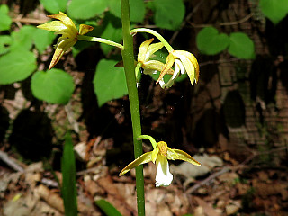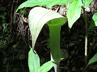 | 山行記 | ●地元の新聞に、茶臼山でヤマシャクヤクが咲き始めたという話題が載った。昨年もそれを目当てに訪れたが、結局見つけられなかったという苦い思い出があり、今年こそはと山仲間と一緒に出かけてみることにした。 ●この時期の茶臼山は、芝桜祭りで大混雑することが予想されるので、朝早く豊川を出たが、その時間からメインの駐車場へ向かう道路は既に大渋滞。こちらは最初からその駐車場へ停める気は無いので、混雑とは反対方向の長野県側の小鳥茶屋方面へ進む。 ●小鳥茶屋にはまだ車は1台しか停まっていなかったが、昨年と同じく、遠慮してそれより少し下の駐車場に車を停める。この時間のこの辺りは、メインの駐車場付近とは打って変わって静かだ。 ●この日は、数日前の暑さから一転して風も冷たい肌寒い程の気候だ。支度を済ますと、舗装路を少し歩き、自然観察路入口から遊歩道に入る。薄暗い原生林の中、スルガテンナンショウやクルマムグラ、ウマノアシガタなどが咲いているが、お目当てのヤマシャクヤクを見つけることができない。 ●それでも、整備された原生林の中の遊歩道を楽しみながら歩いていくと、再び舗装道と出会うがそれを渡った所がカエル館だ。カエル館でヤマシャクヤクの情報を得ようと思ったが、この時間まだ開館していなかった。 ●カエル館の裏へ続く山道を登ると、またまた舗装路に出るが、それを渡ったところが茶臼山への東登山口で、そこから茶臼山への登りが始まる。ここから山頂にかけてはしばらく不規則なジグザグの登りが続き、斜面にはエンレイソウやツクバネソウ、ミヤマミミナグサなどが咲いていた。 ●いつも見る雷岩まで来ると山頂も近いが道は急になる。それを登り切れば、長野県側の展望台の跡地に出るが、そこは既に山頂の一角で、そこから平坦な道を進めば三角点や展望台のある茶臼山山頂だ。 ●展望台に上がると、萩太郎山山頂付近の芝桜が俯瞰できる。思った通り下の道は、駐車場待ちの車でいっぱいだ。芝桜は、そこから少し進んだ、西登山口方面への下降点辺りからの方が良く見えることがわかった。 ●茶臼山からは、西登山口方面への急な道を下り、長野県側への分岐から雷岩方面へ山腹道を戻る。雷岩からは、来た道を戻り、開館したカエル館で情報を収集する、教えられた通りカエル館から少し舗装道を進み、展望駐車場の先から左の林道を進み、矢作川源流方面へ向かう。 ●矢作川源流から流れに沿って下っていくと先程の遊歩道に出て、小鳥茶屋に戻ることができるのだが、肝心なヤマシャクヤクはやはり見つけることができなかった。 ●小鳥茶屋で御幣餅を頂きながらヤマシャクヤクの情報を収集していると、案内してくれるという方が現れたので、その方の後に付いて、ヤマシャクヤクのある所まで案内していただいた。ということで、2年越しの念願は、ようやく叶えることができた。 |
