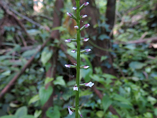 | 山行記 | ●ササユリの咲き具合が気になって、約1か月ぶりに衣笠自然歩道を歩きに出かけた。この日の朝は少し涼しかったが、昼間は暑くなるというので、早朝の涼しいうちに登ってしまおうと考えた。 ●滝頭公園駐車場にはまだ数台しか車が停まっておらず。車を停めると早速舗装道を歩いて藤七原湿地へ向かう。この時期ネズミモチやテイカカズラが各所で咲いており、足下にはワルナスビやシロノセンダングサなどが咲いていた。 ●藤七原湿地に入ると、期待していたカキランはまだ蕾、ノハナショウブも遠くに1輪咲いていただけで、まだのよう、モウセンゴケもその特徴的な葉を確認することができなかった。 ●藤七原湿地から殿様新道を登り衣笠山を目指す。樹林帯の中はまだましだが、風もほとんどなく、既に陽射しも強くなってきて気温も上昇してきたので、汗が玉のように滴り落ちる。 ●衣笠山山頂に着くが、強い日差しの当たる展望台はそこそこにして、樹林帯の桟敷岩新道に逃げ込む。直登コースと出合い広い防火帯の中を歩くようになると、暑いので日影を選んで歩く。この辺りは、ウバユリの花芽が目立つ外はこれといった花は見られず、ササユリも葉は見かけるが、なかなか花芽も見ることができなかった。 ●仁崎峠からは、いつもの滝頭山への急登を登る。日向程ではないものの、汗が目に入って痛いので、しばしば立ち止まっては汗を拭き、熱中症予防のために水分を補給する。 ●滝頭山からは、いつものように長興寺自然歩道を歩いて、一時は外れて落ちていた山名表示が真新しく付け替えられた中西山を越え、分岐から荒れた林道方面へ下るが、分岐にも真新しい案内板が付けられていた。 ●春を過ぎて随分草木の伸びた荒れた林道からは、いつものように不動岳方面へ向かう。道沿いの草も少し煩わしくなってきた感じの道を進み、三ツ俣、迷子尾根の頭を経て不動岳に着く。 ●不動岳からは再び防火帯の広い道に変わり、この辺りも花芽を付けたササユリの葉は見るが、咲いているものはごく僅かだ。さらに赤松山を越えて扇原からクチナシの道を下る。 ●クチナシの道には咲いているササユリが多く見られたが、蕾も多く、まだまだこれからといった感じだ。クチナシの道を下ると、スポーツをする人達の声が聞こえる、既に満杯になった滝頭公園駐車場まで戻った。 |