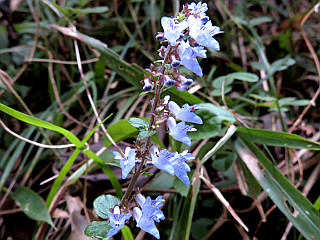 | 山行記 | ●前回ここを訪れてから3週間が経ち、秋の花の様子も大分変わったのではないかと思い出かけてみることにした。この時間、比丘尼駐車場にはまだ1台の車も停まっていない。天気は、晴れの予報だが、空には雲が多くどんよりとしている。 ●早速歩き始めるが、まずは、エンシュウハグマがお出迎えだ。その後は、ツリガネニンジンやオケラ、ヤマハッカなど秋の花が次々と現れ、花期の長いのか、狂い咲きなのか、シモツケも見ることができた。 ●東屋からの上り坂では、登山道にツクシハギが垂れ下がり歩きにくい。宇利城址、愛の鐘を経て、おすすめの小径から離れて金山へ向かう。樹林の中ではイヌヤマハッカがかたまって咲いていた。 ●林道を横切り、花の無いジグザグの斜面を登り切ると金山山頂だ。山頂で少し休憩をして県境稜線を進む。今年は台風の当たり年で、来る度に新たな倒木が道を塞ぎ、大きな落枝も多く荒れた感じで、25号台風の塩害で傷んだ木々の葉も痛々しい。 ●裸地では、ミカワマツムシソウやツリガネニンジンの花が真っ盛りで、ホソバアレノノギクも咲き始めていた。展望ピーク周辺ではムラサキセンブリがぽつぽつと咲き始めていた。 ●雨生山を往復し、展望ピークから雨生山反射板へ下るが、この辺りの方がムラサキセンブリがよく咲いている。サワシロギクが目立つ道を進んで新城方面へ下り、林道出合からそれをしばらく下る。 ●鉄塔入口からおすすめの小径に合流し、2か所の裸地を越えるが、上の裸地の方が花が多かった。この辺りから、逆コースを登る登山者や花目当ての人が増えてきた。西登山口から比丘尼駐車場まで戻るが、駐車場や周辺の道路は車で溢れていた。 |