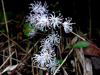 | 山行記 | ●この日は久しぶりの職場のクラブの山行だ。天気は晴れの予報なのだが、実際は朝から雲が厚く薄暗く、比丘尼駐車場に着く前には僅かに雨が降るといった状況で、なかなかテンションも上がらない。 ●比丘尼駐車場に到着すると、とりあえず出発する。エンシュウハグマがよく咲いており、センブリやムラサキセンブリ、リュウノウギクなども咲いていて、開いてはいないがリンドウも見ることができた。 ●いつものとおり、宇利城址から愛の鐘で一人ずつ鐘をひと鳴らしし金山へ向かう。以前目立った倒木は処理されていたが、落枝が多く、足下が不安定で歩きにくい。 ●金山山頂で記念写真を撮って県境稜線を進むが、やはり、落枝や落ち葉で滑りやすいので注意しながら歩く。裸地に出ると、ツリガネニンジンやミカワマツムシソウ、ホソバアレノノギクなどがよく咲いていた。 ●雨生山山頂からは、展望ピークまで戻り、雨生山反射板へ下るが、ムラサキセンブリやリンドウ、ホソバアレノノギクなどがいたるところで咲いていた。 ●雨生山反射板から新城方面へ下り林道を歩くがこの辺りの花は少なく、そろそろ花の季節も終わりのような感じで寂しい。林道からおすすめの小径を通って西登山口に下り、農道を歩いて車を停めた比丘尼駐車場まで戻った。 |