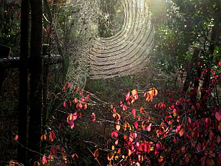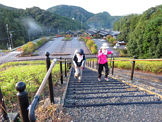| 伊太和里の湯から緩やかな長い階段を登る | 逆光の紅葉と蜘蛛の巣がいい感じ | 柏原分岐 |