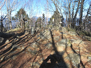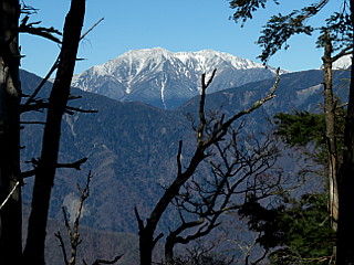 | 山行記 | ●当初はこの日、比良の蓬莱山に登ろうと思っていたが、その方面の天気予報が思わしくなく、太平洋側はいいようなので、急遽変更して、かねてより登りたかった安倍奥のこの山を目指すことにした。 ●朝5時過ぎに豊川を出て新東名の新静岡ICで下り、登山口がある梅ヶ島温泉方面へ進む。梅ヶ島温泉は、高速道路を下りてからが長いが、まだ時間が早いのでそれほど混雑しておらず、約3時間かからずに梅ヶ島温泉に着いた。 ●しかし、そこから安部川林道に入り舗装されているが狭い林道を5km以上上らなくてはならない。それでも、対向車がほとんど無いので、スムーズに登山口近くの駐車場に着くことができた。 ●この日は天気も良く放射冷却もあり、今シーズン一番の冷え込みで、車の外気温計も、梅ヶ島温泉の辺りで4度、林道を上り登山口付近では0度を示していた。駐車場で車を降りるとその低温を実感するが、太陽が当たるところはむしろ暖かい。 ●駐車場のすぐ先にある登山口から登り始める。紅葉も終わり、すっかり葉を落とした明るい樹林帯を登る。支尾根の登りは単調で意外に斜度もあり、気温は低いが風が無いので汗が出る。 ●途中、阿部峠への分岐を分けるとさらに急な登りになるが、道沿いには大きな霜柱が目立つようになる。周囲が開けると、富士突然山の姿が目に飛び込んでくる。やや木の枝が邪魔だが、晴れ渡る空をバックに富士山の雄姿を間近に楽しむことができた。 ●以降は、笹と雑木の尾根を登る。山腹に付けられた急な道は、折り返しても折り返しても続き、途中にはロープの張られた岩を登るような区間もある。 ●概して急な道は淡々と続き、何の表示も無い八紘沢の頭に着く。そこからは少し下り、再び急な坂を登る。それを登り切ったところが山頂かと思うが、そこから平坦な道を進んだところが八紘嶺の山頂だ。 ●古いガイドブックでは、山頂は気が刈り掃われて展望がいいとなっているが、現在は木々が伸びて展望は、葉を落とした木々の間から、ようやく富士山や南アルプスなどが見えるだけで、少しがっかりする。 ●それでも、木々の間から、雪を被った南アルプスの峰々を写真に収め、下山にかかる。登りでは一組の登山者にも会わなかったが、下りでは多くの登山者とすれ違い、この山の人気を垣間見ることができた。 |