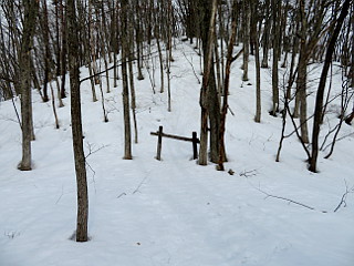 | 山行記 | ●「栂池高原雪の祭典」にあわせて、今年一度も行くことができなかった雪遊びにスノーシューを持って出かけることにした。とは言っても、一日目の栂池の天気の予想は雪ではなく雨だったので、雪山以外で楽しもうと豊川を早朝に出た。 ●ところが、天気は順調に回復し、晴れ間も見える程になった。それではと、時間も遅くなり急遽なので、「困ったときの落倉浅間山」へ行くことにした。 ●ゲレンデでそり遊びをするという妻をこの日の宿舎で下ろして落倉浅間山の登山口へ向かう。この時期にしては珍しく路上に雪の無い舗装道を走って林道入口に着いたが、林道の雪はそれ程厚くなく、スノーシューを履いて出発するが、途中で路面が出てくるのではないかと心配だった。 ●しかし、林道は路面が露出している箇所も無く、雪も丁度良いぐらいに締まっていて歩きやすい。少し長い緩やかな直線の道を進むと、数回折り返し傾斜もやや急になってくる。途中、北アルプスが見える展望地があるが、この日は山沿いで雪が降っているので残念ながら見ることができない。 ●林道終点に着くと、山道に入るのだが、入口の表示が見つからないので適当に樹林の中へ踏み入るが、逆にどこを歩いても稜線を進むだけなので問題は無い。 ●稜線の雪も歩きやすく、少し緩やかに下ると鳥居が現れる。鳥居は上の梁が無くなっており痛々しく、雪は人が潜れない程の高さだ。鳥居で一礼すると、いよいよ急な登りが始まる。今回は急斜面の雪の付きも良く、階段が見えない程なので、登りはスノーシューで何とか登ることができた。 ●急坂が終わり道が緩やかになると、石垣で囲われた祠が現れるが、ここが落倉浅間山の山頂だ。山頂は木々に囲まれているが木々の間から栂池高原スキー場を見ることができる。本来なら、北アルプスも見ることができるのだがこの日は無理そうだ。 ●帰りは同じ道を戻り、再び栂池高原の宿舎へ戻った。夜は「栂池高原雪の祭典」が行われ、多くのスキー客とともに、松明滑降や、雪上車のパレード、打ち上げ花火、振る舞い酒などを楽しんだ。 |