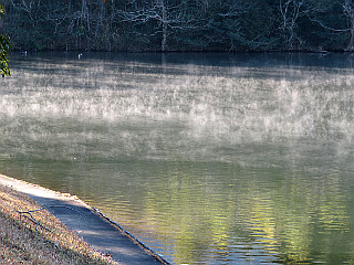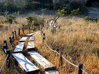 | 朝の冷え込みで霧が立つ溜池 | 葦毛湿原の木道にも霜が残る | 一息峠 |