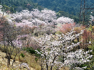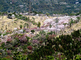| 桜が見頃を迎えた比丘尼城址とハルリンドウが一斉に咲く県境稜線 | ||