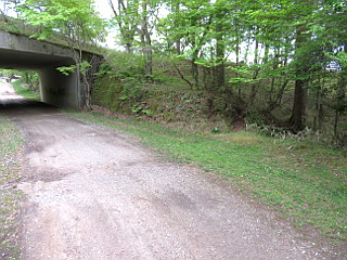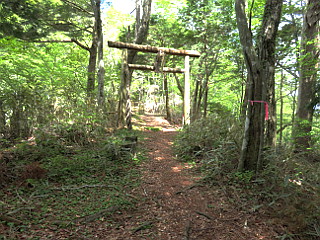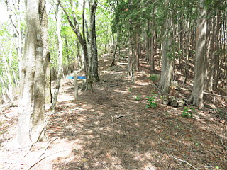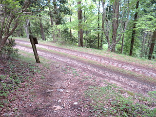 | 天狗の広場を下ると林道に出る | 林道から見る三ツ瀬明神山 | 林道から木地師屋敷跡への下降点 |