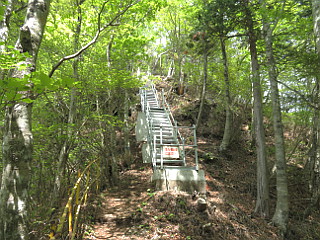 | 面ノ木第三園地駐車場 | 鳥居のある天狗の広場 | 天狗棚展望台へ続く急な鉄製の階段 |