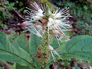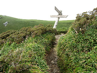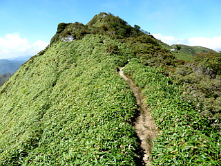 | 山行記 | ●中国四国遠征の最終日は三嶺、今回一番のボリュームがある山だ。しかし、それよりも四国の山はアプローチが大変だというイメージがつきまとう。かつて百名山登山で訪れた時も、舗装はされているものの狭くカーブの多い山道に難渋した覚えがある。 ●今回も仮眠したつるぎ町の道の駅からいきなりすれ違いに困りそうな細い道が続く。舗装もされ部分部分広くなったりしてはいるものの、カーブが多く狭い道にはカーブミラーが無い区間もあり、四国の国道が「酷道」と呼ばれるのも納得できる。 ●幸い早朝なので対向車も少なく、スムーズに登山口の駐車場まで行き着くことができたが、カーブの連続でハンドルを切る腕は既に疲れ気味だ。それでも、登山口の県営無料駐車場に着くと、楽しい案山子たちが出迎えてくれた。 ●平日ということもあり、駐車場には車は2台しか停まっていない。こちらも支度を済ませて早速出発する。駐車場の奥の林道をを歩くとすぐに登山口の案内があるので、それに従って山道に入る。 ●いきなり木の階段のある急登が始まる。すぐに鉄塔が現れるが、それを過ぎてさらに樹林帯の中の急な尾根をひたすら登る。急坂が少し落ち着くと突然林道に出るので、それを少し歩いて、すぐ現れる案内に従って再び山道に入る。 ●緩やかな広い尾根道歩きだが、どこでも歩くことのできる道なので、知らないうちに道を外すことのないように赤テープを確認しながら登る。さらに登ると「ダケモミの丘」と呼ばれる緩やかなピークに出る。 ●「ダケモミの丘」の案内はその先にもあり、そこは現在閉鎖されている谷から来る道との合流点になっている。ダケモミの丘から少し下ると道は急になり、それを登り切ると別の尾根に出て道は右に大きく曲がる。 ●以降は、顕著な尾根道を緩やかに登っていくのだが、ここに来て、ここまで花っ気の無かったのが嘘のようにカニコウモリやテンニンソウなど花の群生が目立つようになる。 ●道はしだいに急になり、樹林帯から抜け出してガレた急坂を登るようになる。途中水場の案内を見送り、岩と木の根と階段の急坂を、斜面に咲くリンドウやシコクフウロなどに励まされながらひたすら登っていくと、分岐の道標が現れ周囲が開ける。 ●正面には池が見え、右へ行けば三嶺ヒュッテ、左に行けば三嶺の山頂だ。この時ガスが晴れ三嶺の山頂部が見えてきた。山頂に向けて登り始めると、背後に池と三嶺ヒュッテのある情景がまるで箱庭のようだ。 ●花も、ヤマハハコやヤマラッキョウ、アキノキリンソウ、ツリガネニンジンなどがぽつぽつと咲いている。三嶺の山頂部を見ながら痩せた尾根を登り詰めると、高知県最高峰の三嶺山頂に到着だ。 ●三嶺山頂に着く頃には、これまで見えていた青空もガスが増えてきて周囲もその合間にしか見ることができなくなってきた。期待していた剣山も見えずがっかりではあったが、伸びやかなササの稜線上に続く四国山地の縦走路は見ることができた。 ●今回最後の頂で少し時間を過ごした後、下山にかかる。下山は来た道を戻ったが、この日出会ったのはたった数組だった。下山後は徳島自動車道から鳴門海峡を渡って長い長い道のり走り、豊川を目指した。 ●今回で、都道府県最高峰登頂数は40となり、残る7山については、今後焦らずに機会を作っては登っていければいいと思っている。 |
