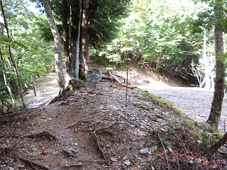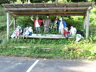 | 案山子が出迎えてくれる県営無料駐車場 | 尾根コース登山口 | 林道出合 |