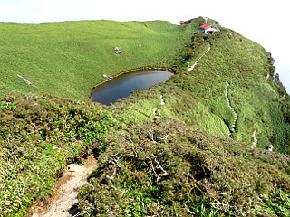 | 三嶺ヒュッテ分岐 | 三嶺ヒュッテと池を見下ろす | 三嶺の山頂部が見える |