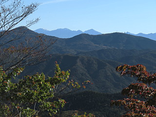 | 天狗棚展望台から見た富士山 | コアブラツツジの紅葉と三ツ瀬明神山 | 木地師屋敷跡への下降点 |
