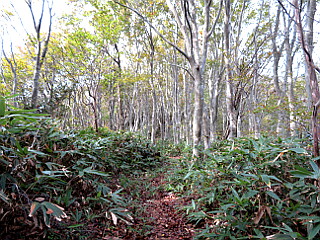 | 山行記 | ●この日は、翌日未明出発の九州遠征を控えているのだが、山友との日程調整の結果、この日に山行へ行くことになってしまった。行く先は、以前から気になっていた敦賀半島の西方ヶ岳で、紅葉と若狭湾などの展望が期待できる。 ●遠いイメージの福井県だが、意外にも高速道路を利用すれば豊川から2時間程度で行くことができる。敦賀インターを出ると、ナビの案内に従って車を走らせ、登山口の常宮神社の駐車場に車を停めさせていただいて歩き始める。 ●常宮神社からは親切丁寧な案内に従って、民家の間から林道を進む。やがて林道が終点になると本格的な登山道が始まる。コシダが目立つ登山道は階段が多く、階段嫌いには登りにくい道だ。 ●樹林の中のやや急な登山道を少し登ると「奥の院展望台」に出る。麓からも確認できる大岩の上に登れば、若狭湾や敦賀の市街地がよく見えるが、逆光のうえに霞んでいるので細かいところはよく確認できなかった。 ●さらに登り、送電線鉄塔の横を過ぎると一旦傾斜は緩くなり、それから再び登ると「銀命水」という水場が現れる。石窟の中に落ちる水を備え付けのコップで飲んでみたが、程好い冷たさで美味しい水だった。 ●銀命水から少し登た後、尾根上の急坂を登ると「オウム岩」に着くが、岩上からは周囲の展望がる。オウム岩から少し登り、地図上の580mのピークを越えると、道は緩やかなブナの美しい尾根道に変わる。 ●緩やかな道が少しだけ急になると、やがて立派な避難小屋が建っている西方ヶ岳の山頂広場に到着する。山頂からの展望は無いが、少し下った岩上からは展望が広がり、若狭湾はもちろん、これから向かう蠑螺ヶ岳方面も見ることができる。 ●西方ヶ岳山頂から、方向的には逆になるので戸惑ったが、避難小屋の左から蠑螺ヶ岳を目指す。すぐに分岐が現れ、直進すると三角点があるというので寄っていくことにして、藪っぽい道を少し登ると目立たない三角点を見つけることができた。 ●分岐に戻って今度は蠑螺ヶ岳方面へ進む。一旦急に下ると、後はアップダウンを繰り返しながら尾根道を歩くが、この辺りもブナ林が美しい。 ●途中カモシカ台分岐があるが、カモシカ台へ行くのはパスしひたすら進めば蠑螺ヶ岳山頂に到着する。ガイドブックには360度の展望とあるが、草木が伸びて展望はそれほど良くない。それでも草木の上から見える水島は南の島のようで美しかった。 ●蠑螺ヶ岳から後は浦底へ下るだけだが距離的にはまだ3kmある。山頂から少し下り登り返すと「一枚岩展望台」が現れ、そこからの展望も素晴らしいとのことだが、天気は曇りで展望も利きそうにないのでそれもパスして進む。 ●しだいに下り坂は傾斜を増すが、それをひたすら下っていくと、先程蠑螺ヶ岳山頂から見えた水島が段々大きく見えてくる。最期は傾斜が緩んでくるが、今度は粘土質の滑りやすい道が続くのでなかなか気を緩めることができない。 ●そこを通過すると、工事中の道に出るので、それを横切りその向こうにある狭い道を下ると原電の寮が見えてくる。すぐに県道に出るが、そこに原電の送迎バスを待つための屋根付きのベンチがあったので、そこでタクシーを呼び、車を置いた常宮神社駐車場へ戻った。 |