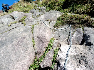 | 国見岳への登りは険しく鎖場もある | 国見岳山頂 | 国見岳山頂から見る普賢岳と平成新山 |
