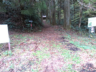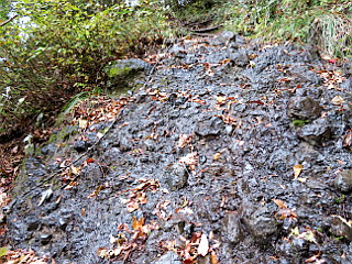 | 登山道入口 奥が男体山神社 | ロープの張られた濡れた滑りやすい岩場 | 袋田の滝方面分岐 |