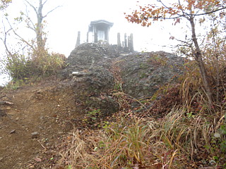 | 山行記 | ●八溝山登山口から久慈男体山の登山口である男体神社下の男体山麓駐車場に着くが、雨は一向に止む気配がない。それでもあまりボリュームのある山でもなく、せっかく遠くまで来たのだからと思い、カッパを着て登ることにした。 ●登山道は男体神社へ続く参道ではなく、参道入口の左手に付けられた坂道を登る。道は湿っていて滑りやすいが、雨が降っている最中で余計に滑るので帰路を心配しながら登る。 ●途中ロープが張られた岩場が何箇所か現れる。乾いていれば難無く登降できるレベルの岩場だが、雨の中さらに滑りやすくなっており慎重に通過する。 ●やがて分岐が現れるが、そこで袋田の滝や月居山方面からの道と合流する。その後、奥久慈グリーンライン分岐を分け進むのだが、この辺りの紅葉はいい時季を迎えており、樹間の紅葉はガスの中でよく映えていた。 ●やがて祠の建つ岩のピークに出るのでそこが山頂かと思うが、山頂はすぐ先で、久慈男体山山頂は三角点や山頂表示のある広場になっている。山頂からは展望が広がるはずなのだが、この天気では望むべくも無い。 ●帰路は来た道をそのまま戻るが、天候は快方にあり、周りの山の山肌なども見えるようになってきて、薄日も差し始めた。これまで山頂の施設で作業をする人以外遇わなかった登山者ともすれ違うようになった。 ●下山後は、このまま雨が降り続くようならば、予定していた月居山登山は省略し袋田の滝の見物のみにしようと思っていたが、この天候の回復具合なら登れるのではないかと思いながら袋田の滝駐車場へ向かった。 |