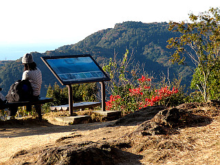 | 山行記 | ●今年の宮路山もみじまつりの開催日を調べていたら、今年から新たに「赤坂宿宮路もみじまつり」と名前が変わり、これまで宮路山の第一駐車場で開催されていたものが、麓の大橋屋で開催されることになった。 ●それと同時に、赤坂宿、御油宿を結んで歩く「宿場町ふれあいウォーキング」を実施するということなので、妻と一緒に出掛けることにした。 ●この時期の、しかも日曜日ということもあるので、宮路山も混雑すると思い、山は朝のうちに登っておこうと、イベントの始まる9時にイベント会場へ行くことができるよう時間を見計らって出かけることにした。 ●結局道の混雑も無く、宮路山第一駐車場には7時過ぎには着くことができた。宮路山第一駐車場には、やはり既に多くの車が停まっており、こちらも支度を済ませると登山口から登り始める。 ●階段を登った後、樹林帯の中の平坦な道を進むと、まずは森林浴コースとドウダンコースの分岐を分け、すぐに樹林帯から抜けたところで、ドウダン展望コースとドウダントンネルコースの分岐に出る。 ●この辺りはコアブラツツジの紅葉が美しいところだが、早朝で太陽光が回っていないのを差し引いても、例年のように赤く紅葉しているものが少なく、葉の傷みもあって紅葉はあまり冴えない。 ●そこの分岐はコアブラツツジを間近に見ることができるドウダントンネルコースへ進む。東屋の所にあるカエデの大木の紅葉は綺麗だが、まだ緑の葉もあり今一つといった感じだ。 ●ドウダントンネルコースは、コアブラツツジの中をジグザグに登っていくが、やはり赤く紅葉しているものが少なく、少々期待外れだ。いつもコースから見える、展望の丘の山肌の紅葉もまだ早いのか、例年程は鮮やかではない。 ●道が上部でドウダン展望コースと合流すると、程無く五井山方面への分岐に出るが、この日はイベントが目当てなので宮路山だけに登ることにして宮路山方面へ向かう。分岐からはすぐに大きな石碑のある宮路山山頂に到着する。 ●山頂には既に数組の登山者が休憩していた。風も無くむしろ暖かい山頂で、いくつかあるベンチの一つに腰を掛けて、三河湾や渥美半島の山々、頻繁に行き来する新幹線などを見ながらしばらく過ごした後下山し、イベント会場へ向かった。 |