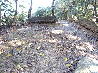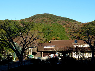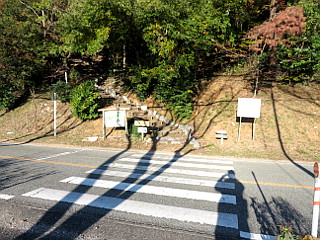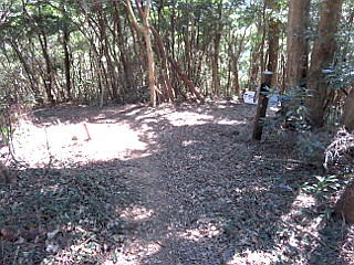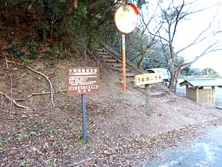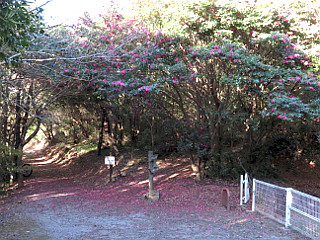 | 滝頭公園駐車場と衣笠山 | 衣笠自然歩道入口 | ツバキ咲く林道終点、松尾岩コース登山口 |