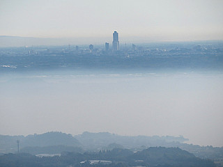 | 富士山とガスに覆われた浜名湖の上に浮かぶ浜松市街を望む弓張山地主稜線 | ||