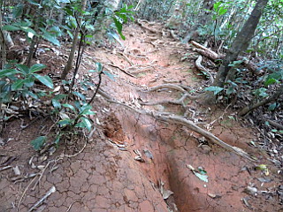 | 木の根が露出する粘土質の登山道 | 野底岳山頂の三角点 | 野底岳から見る於茂登岳 |