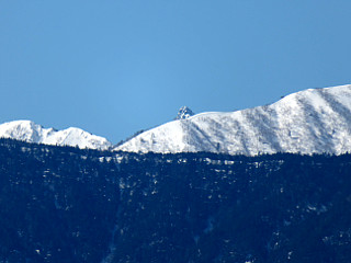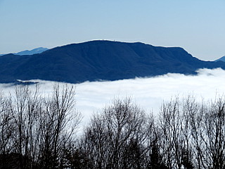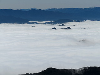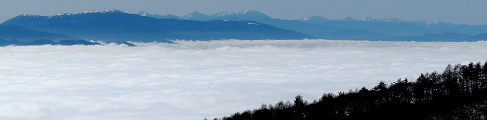 | 山行記 | ●栂池高原最終日は3日のうちで最高の好天となった。宿からも雪の無いスキー場のゲレンデの奥に大迫力の後立山連峰が見えたので、帰りがけに大町山岳博物館へ寄って北アルプスの大展望を見て帰ることにした。 ●ところが、青木湖を過ぎた辺りからガスの中に入ってしまい、北アルプスの展望は絶望かと思われたが、予定どおり大町山岳博物館まで行ってみようと思い車を走らせるが、ガスは増々濃くなり大町山岳博物館に着いてもガスから抜け出すことはなかった。 ●しかし、もう少し標高が上がれば雲の上に出るのではないかと思い、暖冬で道の雪も無さそうなのでそのまま車で鷹狩山山頂を目指すことにした。思ったとおり、標高が上がるのに従い霧が晴れてきて、青空が見えてきた。 ●結局若干雪はあったが轍の部分は雪が無く、問題無く鷹狩山山頂の駐車場まで行くことができた。車を降りると、雲海の向こうにずらりと並ぶ雪を頂いた北アルプスが青空を背景に輝いていた。 ●山頂の展望台に上ると、何にも邪魔されない大展望が広がっていた。北アルプスはもちろん、遠く南アルプスや中央アルプスなども確認することができ、北アルプスの稜線の肩には槍ヶ岳の穂先まで確認することができた。 ●空はまさに雲一つない青空、気温もぐんぐん上昇して過ごしやすい。いつまでも展望を楽しんでいたいところだが、一方では最終日なのでなるべく早く家に着きたいという気持ちもある。 ●しばらく山頂で過ごしていると雲が所々穴が開いてきて、大町の街が見え始めた。また、下から歩いて登ってくるハイカーも次々と到着し始め、車でここまで来たのが少し後ろめたいということもあり、山頂を後にすることにした。 ●この日は、一日中天気が良く、帰路も、北アルプスから八ヶ岳、富士山、南アルプス、中央アルプス、恵那山、御岳など中部地方の主だった山岳を見ながらのとても幸せなドライブとなった。 |