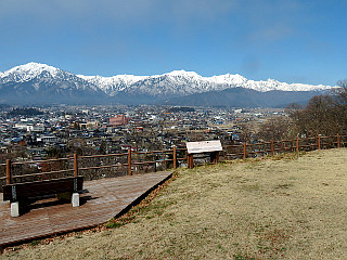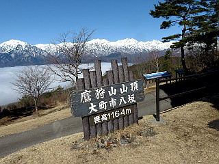 | 鷹狩山山頂の展望台 | 鷹狩山の山頂表示 | 槍ヶ岳の先端が見える |