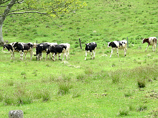 | 森の広場、野外活動ロッジ跡分岐 | 野外センターに下る | 牛が放牧されている茶臼山牧場 |