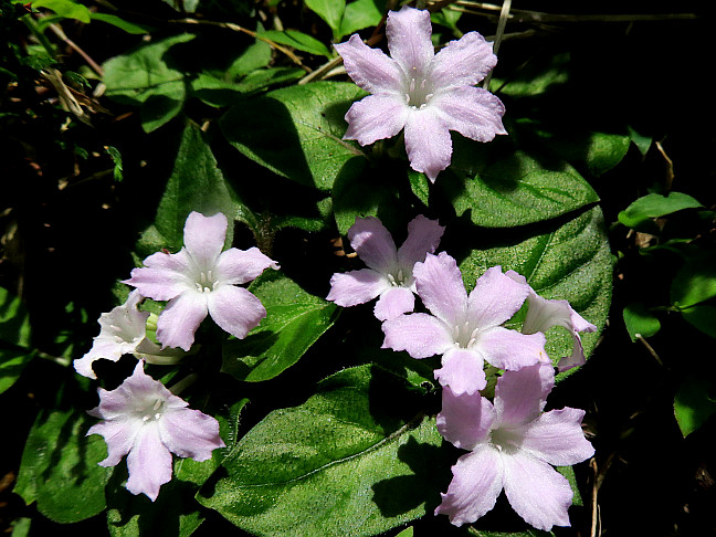 | 山行記 | ●ここは、先週訪れたばかりだが、その時咲き始めだったコアジサイやフタリシズカ、イナモリソウなどが気になって再訪することにした。今回も先週と同じ、西の浅間山登山口から登ることにする。 ●登山口へ向かう途中にも、コアジサイが咲いているのが見られ、いい感じだ。早速登り始めると、やはりコアジサイがすっかりいい時季を迎えており、上品な淡い青色の花が樹林帯の中を彩っていた。 ●大きなジグザグを切って緩やかに上る登山道を登っていくと、シソバタツナミが咲き始めていた。まだまだ蕾が多いが、間違って踏みそうなところにも生えているのは、最近この道があまり歩かれていないことを物語っている。 ●やはり先週と同じく、上部で道が不明瞭になってきたので、今回も途中から直登し、明瞭な道が通る稜線の道に出て、浅間山山頂へ登る。浅間山でお参りをした後、稜線道を辿って弓張山へ向かう。 ●平坦な稜線道ではフタリシズカがよく咲き、先週終わりかけていたツツジなどはもう見ることができなかった。平坦な稜線道は緩やかに上り始め、やがて弓張山山頂の広場に至る。 ●弓張山山頂は広場になっているが樹林に囲まれ展望も無く、地味で山頂らしくない。山頂の一角には電波関係のアンテナなのか、細くて長いアンテナのようなものが立っている。 ●弓張山からしばらく下り坂を下っていくと、左から続く舗装道に合流する。そこから少し舗装道を歩くのだが、この辺りは木々が伐採された後で展望がよく、「富士山」、「南アルプス」などの案内があるが、この日はどちらも見ることができなかった。 ●すぐに山道への入り口が現れるのでそこから再び山道に入るのだが、特に案内も無いので見落とす可能性もある。それでも、見落としたとしても、林道が分岐する弓張山と城山との分岐に出るので特に問題は無い。 ●分岐からは、そのまま稜線に沿って続く山道を進む。やや急な登りは意外と続き、一旦緩やかになった後、少し登ると未舗装の林道に出るので、それを左に行く。 ●すぐに舗装道に出るが、それが先ほどの舗装道の続きで、それをそのまま緩やかに登っていけば、広場に出る。それを囲むように、近隣の山からもよく見えるこの山のシンボルともいえる2基の電波塔が立っている。 ●城山山頂の三角点は広場奥にある石垣の奥の樹林の中にあり、山名表示がたくさんあって賑やかだ。それでも、展望も無く薄暗いので、三角点を確認するとすぐに広場に戻り石垣に腰かけて小休止をした。 ●城山からは、先週と同じように舗装道を歩いて戻ることにした。やはり、明るい舗装道沿いにはコアジサイやウツギなどいろいろな花が咲き、今回の目的の一つのイナモリソウも各所で咲いているのを見ることができた。 ●鞍部を過ぎ、弓張山への登り口まで来たが、今回は今回登ってきた西の浅間山登山口とは反対側の東の登山口を確認したかったので、そのまま舗装道を歩いていくことにした。 ●舗装道は、樹林帯の中を緩やかに上ったり下ったりしながら続く。途中、浅間山方面と渋川方面への分岐があるので、渋川方面へ続く舗装道と別れて、浅間山方面へ続く未舗装道を進む。 ●やがて、明るい広場に出るが、そこが浅間山の東の登り口で、鳥居があり、道の反対側が駐車スペースとなっている。下調べで確認したのとは少々イメージが違ったが、とにかくそこから浅間山へ続く山道を登り始める。 ●西側からの登山道とは違って、登山道らしい急な坂道が続くが、思っていたよりも簡単に浅間山山頂に着くことができた。そして、浅間山山頂で少し休んだ後、朝来た道を戻った。 |
