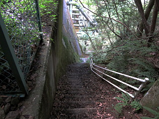| 出合で沢沿いの道に戻る | 珍しい透過型砂防ダムの横を下る急な階段 | 帰りに立ち寄った清酒「雪彦山」蔵元 |