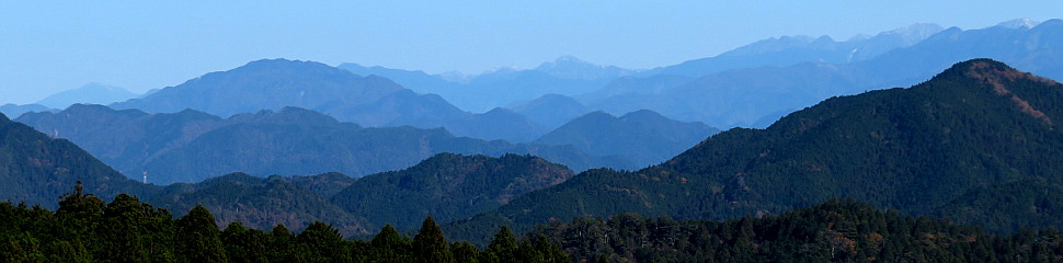 | 伐採地から見る仙丈ケ岳から聖岳までの南アルプスの山並 手前右は鳶の巣山左の少し奥は熊伏山 | ||