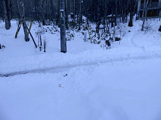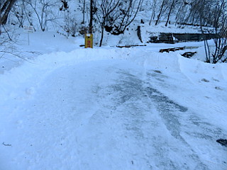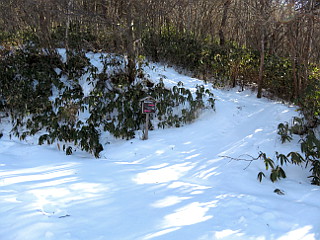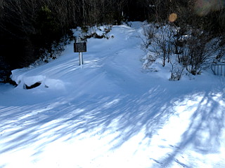 | 舗装道を渡り遊歩道入口から山道へ | 舗装道から再び新雪の山道へ | 好展望の馬の背展望台 |