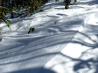 | 馬の背展望台から見る大川入山 | 馬の背下から再び山道へ | 風紋が奇麗だが吹き溜まりなので雪は深い |