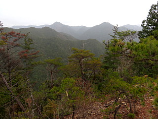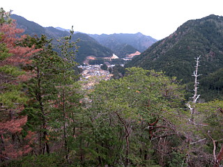 | 岩上から見る川合の集落 | 岩上から見る周囲の山々 | 雨で濡れて登れないラスボス登場でギブアップ |