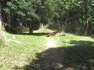 | 豊川自然遊歩道に飛び出す | 財賀寺近道分岐 | テーブルとベンチのある明るい草地 |