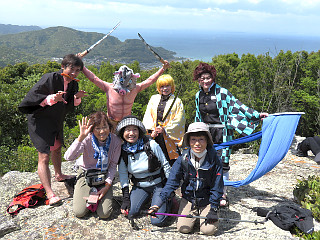 | 滝頭公園駐車場から見る新緑の衣笠山 | 衣笠山山頂 | 桟敷岩には鬼滅の刃のコスプレイヤーが |