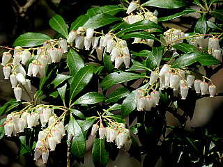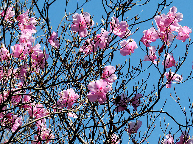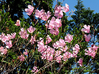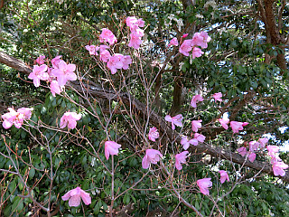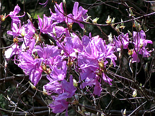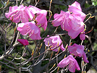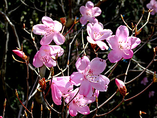 | 山行記 | ●正直、愛知県内でアカヤシオが咲く山は日本ヶ塚山ぐらいしか知らなかったのだが、平山明神山でもアカヤシオが咲き、それを毎年見に行っているという人の情報を得たので、早速行ってみることにした。 ●平山明神山は、愛知の130山を登っている時と、奥三河の稜線を繋いでいる時の二度登っているが、いずれも時期が違っていたので知らないまま登っていた。 ●今回は最短コースの設楽町大神田集落から登ることにして、現地に向かうが、道々ヤマブキやヤブウツギなどがよく咲いており、奥三河の春の花のシーズンが始まっているのを実感する。 ●大神田の登山口近くには広い駐車スペースがあり、熊とフクロウの彫られた木のベンチがある。そこに車を停ると、登山口の大看板の案内に従って登り始める。 ●薄暗い杉の植林帯を緩やかに登っていくと「山の神様」の看板が現れるので、それに従って左に続く道を進むとすぐに山の神様の祠が祀られた広場に着く。広場にはベンチも設置されていた。 ●山の神様をお参りした後、元の道に戻り再び登り始める。道はしだいに傾斜を増し、折り返しながら急な斜面を登っていく。しばらく登っていくと、壊れかけた木のベンチのある広場に着く。 ●広場の先には、夫婦岩への分岐があるが、これは帰りに寄ることにして先へ進む。相変わらず急な登山道を登っていくと、目の前に大きな岸壁が見えてくるが、それを左に回り込んでいくと、大鈴山と明神山との分岐が現れる。 ●ここはもちろん明神山の方へ進むと、程無く西の覗きと明神山山頂との分岐に着くので、まずは西の覗きに寄っていくことにする。西の覗きは岩上の展望台で、茶臼山や碁盤石山などの奥三河の山々を始めとして、恵那山、大川入山、微かにだが遠くは荒川岳、赤石岳などの南アルプスの3000m峰も見ることができた。 ●周辺にはお目当てのアカヤシオが満開で、青空を背景にピンク色の可愛いい花を咲かせていた。外にもアセビやミツバツツジなどが稜線の山肌を彩っていた。 ●西の覗きで展望とアカヤシオを楽しんだ後、一旦先程の分岐まで戻り、今度は平山明神山山頂を目指す。分岐からヒメイワカガミの群生する岩の多い道を登ると、あっけなく山頂表示のある平山明神山山頂に到着する。 ●山頂は樹林に囲まれ展望は無いが、木々の間から見えるアカヤシオがいい感じだ。山頂からは、ヒメイワカガミが咲く道を下って、大岩の間に祠が祀られている小鷹大明神まで行ってみる。 ●小鷹大明神の前も展望が良く、宇連山や城山、弓張山、富幕山なども同定することができ、周囲にはアカヤシオやアセビ、ミツバツツジなどがよく咲いていた。 ●小鷹大明神から一旦平山明神山山頂まで戻り、西の覗き、明神山山頂分岐の手前から右に続く道に入る。標識などは見当たらないが、その先に展望のいい場所があり、それが東の覗きではないかと考えた。そこからも御殿山などの山々を見ることができた。 ●霞んでいた展望も徐々にはっきりとしてきたので、東の覗きから再び西の覗きに戻り、よりはっきりと見えてきた南アルプスなどの展望を楽しんだ後、下山にかかった。 ●途中、往きにお預けにした夫婦岩に寄ってみることにした。分岐から数分で着いた夫婦岩はその名のとおり大小の岩が立ち、その間を通り抜けた所からも展望が得られた。後は来た道をひたすら下った。 |
