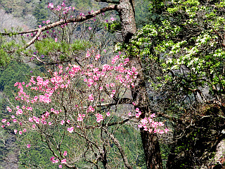 | 西の覗きから見る南アルプス | アカヤシオとアセビが山腹を染める | 夫婦岩 |