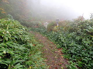| 濃い霧に包まれた田代登山口駐車場 | 田代登山口のゲートを開け閉めして進む | 1合目 |
